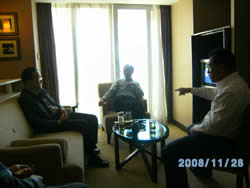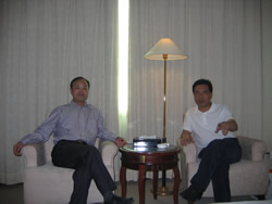 2008年11月28日蒲江县委副书记、县长郭杨(左一)副县长陈代康(右一)与中国果品流通协会常务副会长傅秀泉(中)探讨蒲江果业发展。 |