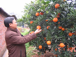 2008年2月24日合作社技术总监高级农艺师龚登明仔细观察晚熟柑桔在无设施保护情况下,经过低湿暴风雨冻害后的情况. |