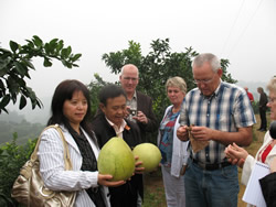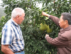 2008年10月15日挪威农业考察团一行在川农大曾伟光教授的陪同下考察了蒲江杂柑专业合作社的优质杂柑基地,办公场所和水果商品化处理生产线. |