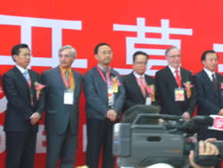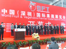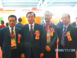 2008年11月28日蒲江县委副书记、县长郭杨(右图左三)参加“2008年中国(深圳)国际果蔬展览会”开幕式。 |