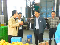 2008年11月20日蒲江县委副书记、县长郭杨(左一)率县政府办主任马生将(右一)县农发局副局长周燕武一行调研合作社柑桔加工厂。 |