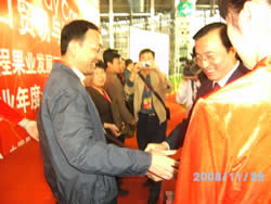 2008年11月28日中华供销合作总社副主任、中国果品流通协会会长赵显人(右)向蒲江县委副书记、县长郭杨(左)授牌,授予四川省蒲江县为“全国兴果富农工程果业发展百强优质示范县”。 |