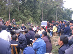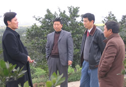 2007年3月25日蒲江县农村发展局陈仕刚局长(左图右一)陪同中国果品流通协会常务副会长傅秀泉(左图右二)参加合作社石象湖片区春季杂柑管理技术培训会,理事长袁静秋(左图左二)与技术总监龚登明老师(左图左一)向社员讲授杂柑管理技术。 |