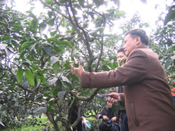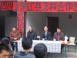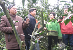 2007年3月14日合作社邀请蒲江县科技局高兰局长(右二)蒲江县农村发展局果树站雷清良站长(左二)在合作社基地联合展开2007年春季杂柑修剪研讨现场会. |