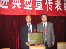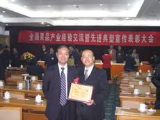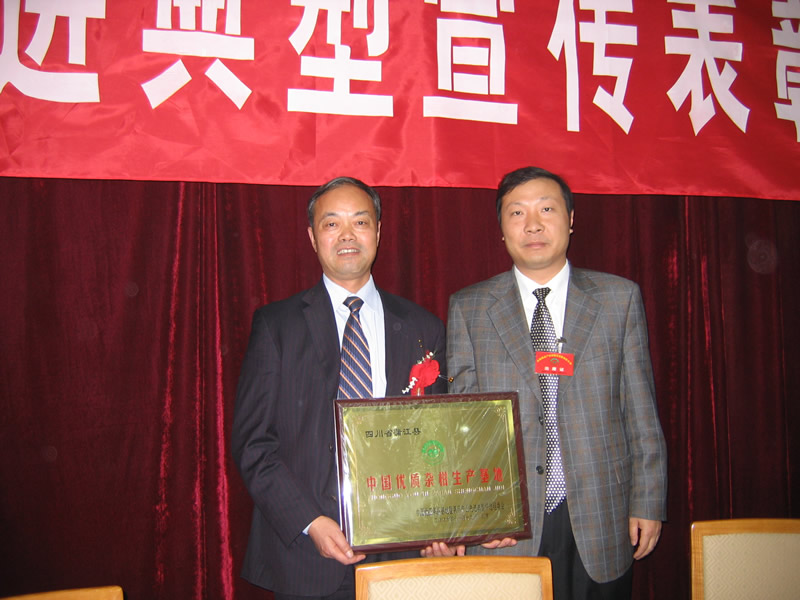蒲江县委常委副县长欧俊波(右)在北京领取奖向获奖地区授牌并合影留恋