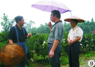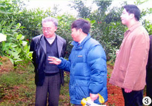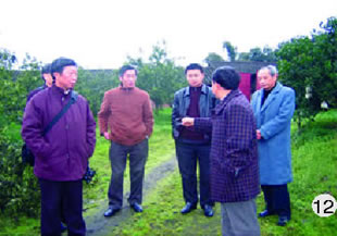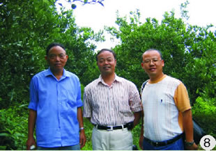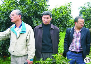 11、台湾嘉义国立大学吕明雄教授(左1)、四川农业大学王永清教授(中)参观合作社优质杂柑生产基地. |