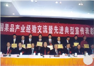 5、合作社理事长袁静秋荣获“中国果品生产优秀企业家”称号并受到全国人大常委会副委员长布赫(前排左5)中国果品流通协会常务副会长傅秀泉(前排左6)的接见并合影留念. |