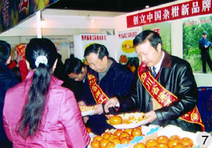 7、蒲江县委常委副县长欧俊波(右)、鹤山镇党委书记陈贵(中)在西部农博会上为"蒲江杂柑"宣传. |